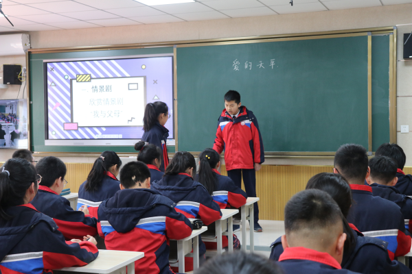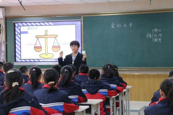 孙新印老师的主题班会《爱的天平》,以情景剧《我与父母》导入,引出了我与父母的故事、爱的天平、如何加重砝码等几个方面,尤其最后的精彩时刻,全体父母对儿女的表白视频,更是让学生们深刻感受父母之爱:爱的天平永远是不对等的,应该感恩父母,从现在开始!